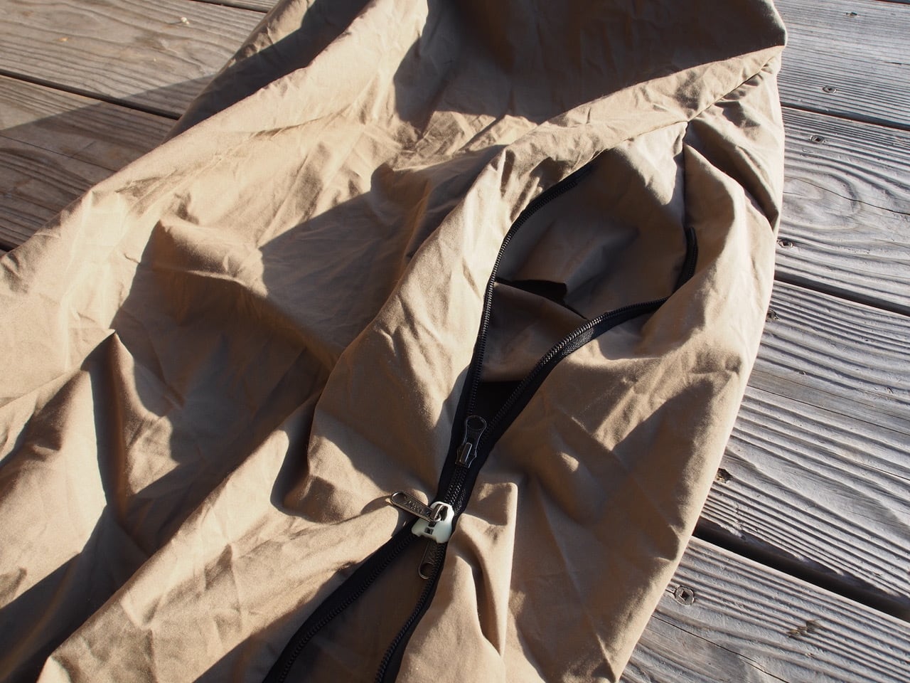 オリジナルの防水性はありませんが、ポリエステルとケブラーの混合素材なので、従来のナイロンタフタよりは撥水性も高く、当時なかった撥水ダウンというダウンを使用することができたので、日本初(世界?)の焚き火用寝袋として商品化することにしました。
